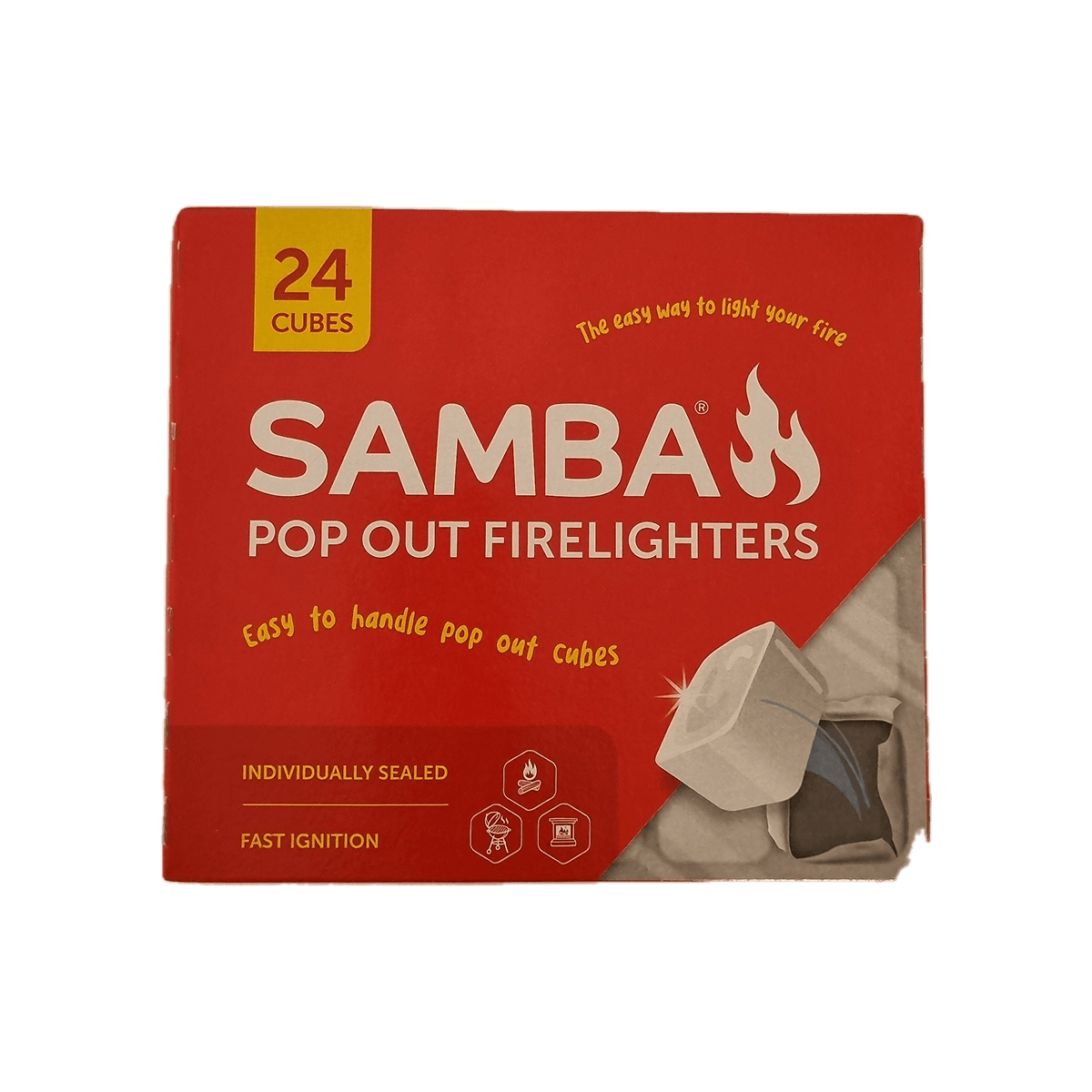 Samba Pop Out Firelighters are the no-fuss, clean handling way to start your fire. Simply pop cubes out, straight into kindling, charcoal or briquettes and light. Perfect for use in fireplaces, wood fires or barbecues.